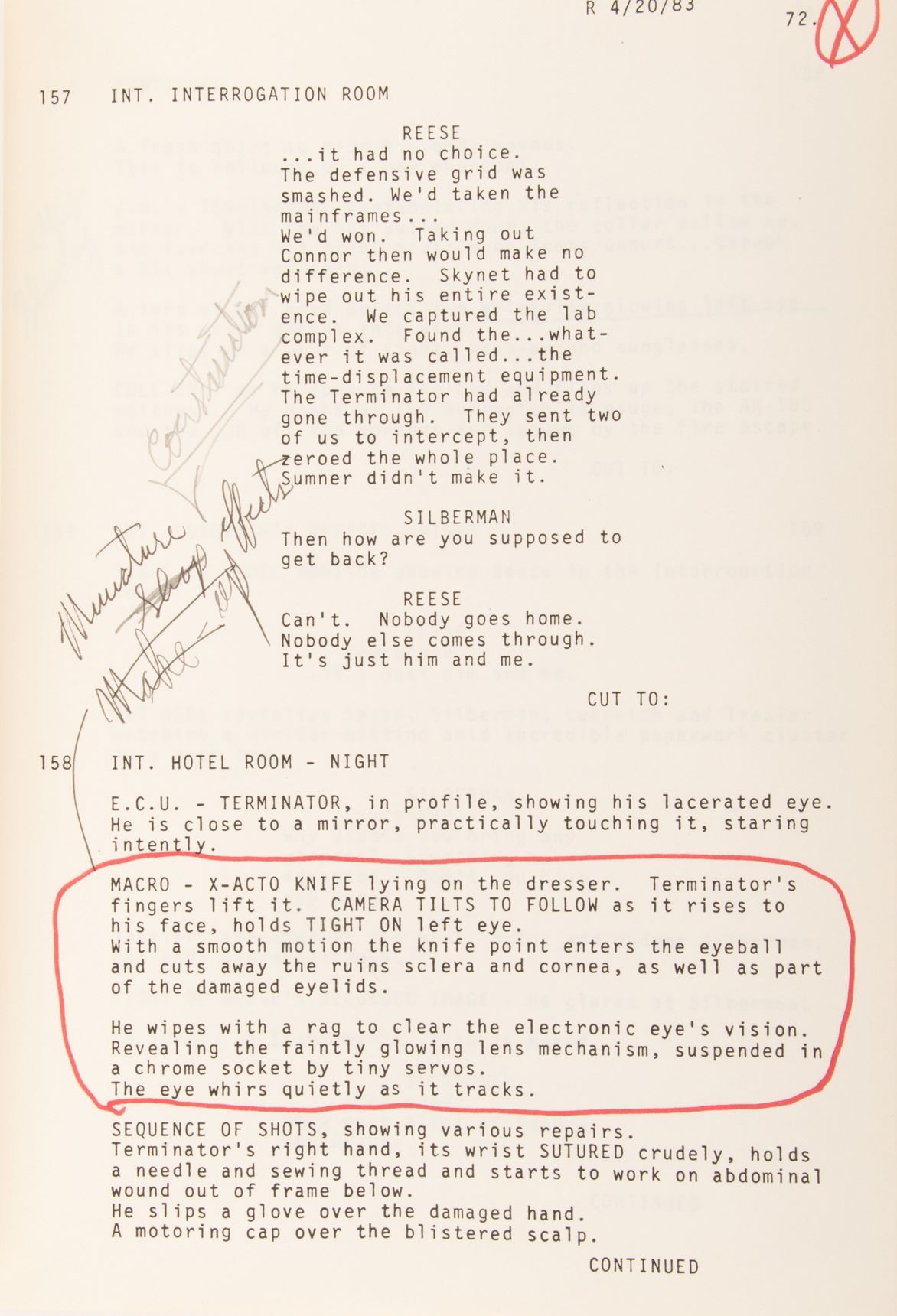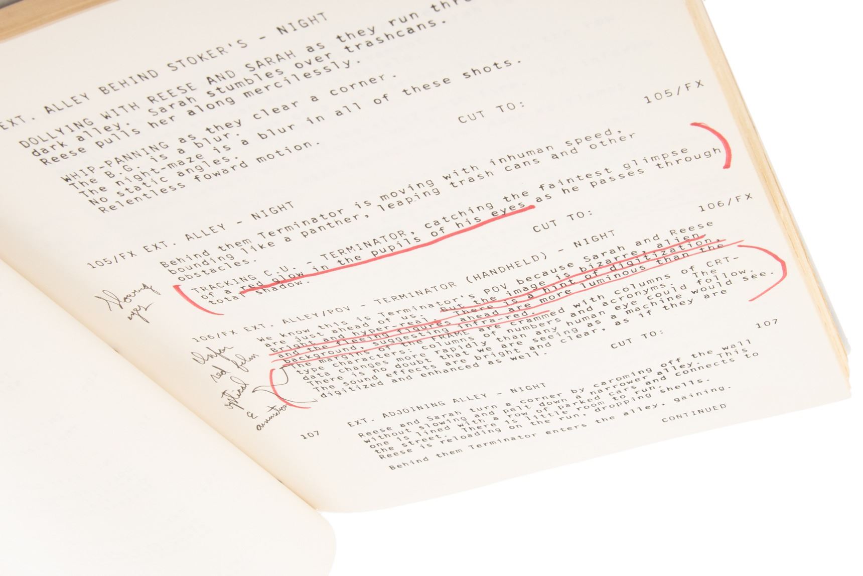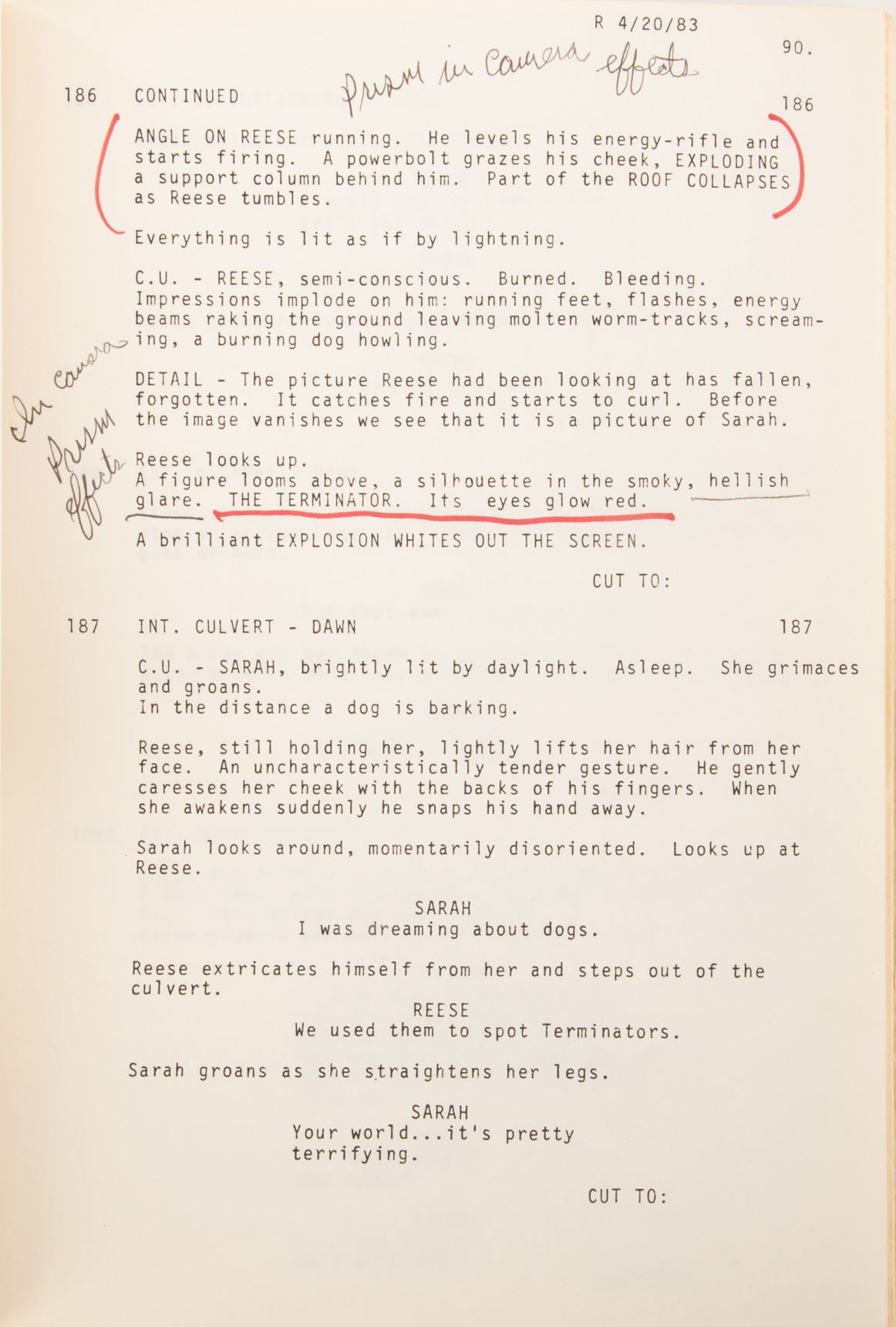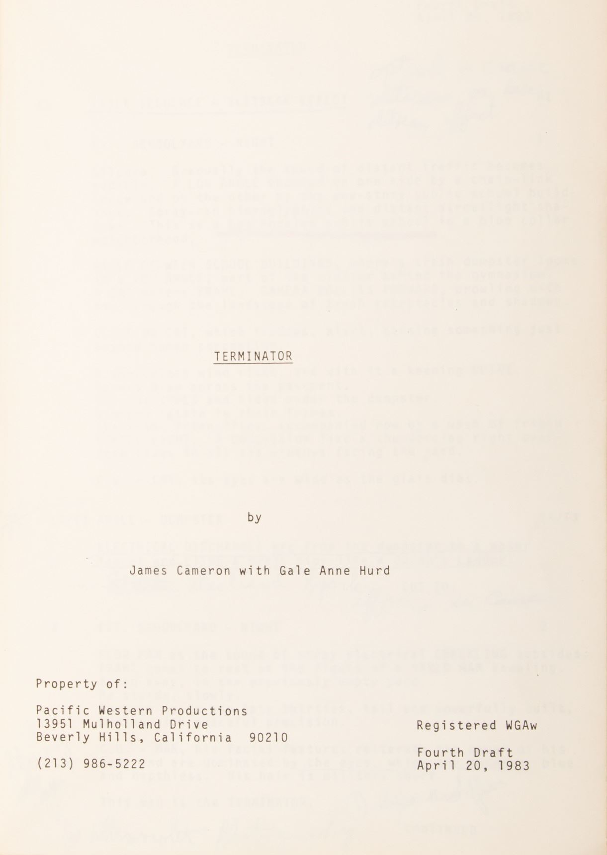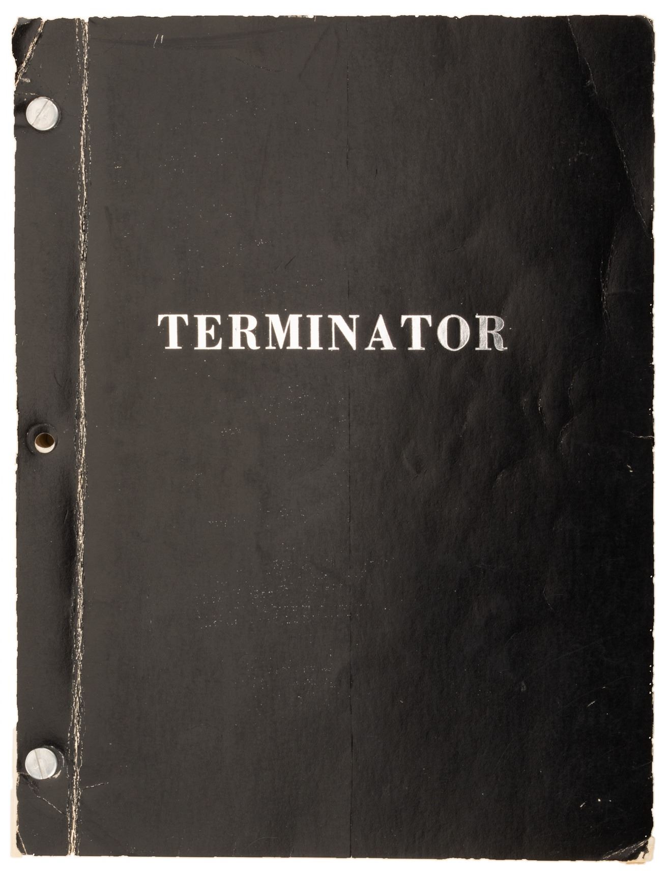 321. The Terminator Fourth Draft shooting script.(Orion, 1984) Vintage original studio bound and bradded 129-page Fourth Draft script written by James Cameron with Gale Anne Hurd, dated on title page April 20, 1983, with some handwritten notes in pencil and red ink. Exhibiting production wear, creasing and slightly torn back cover. In vintage very good condition. $300 - $500