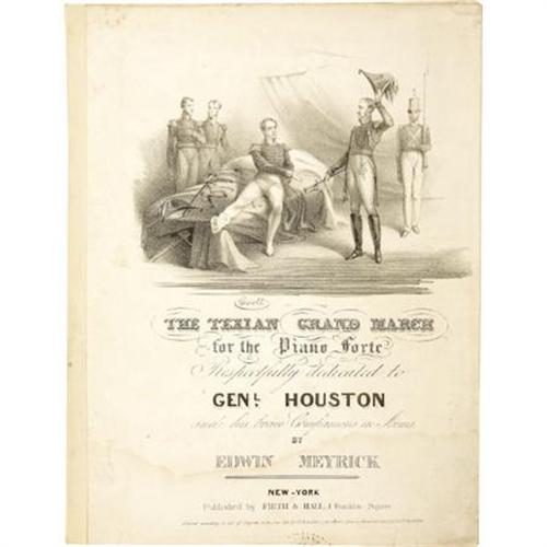 <B><I>The Texian Grand March,</B></I></B></I> apparently seven pages, 9.75" x 12.75". Firth & Hall: New-York, 1836. Engraving on the cover page, 8" x 5.75", depicting a wounded Gen. Sam Houston accepting Gen. Santa Anna's sword. Lithographer identified as "<I>Swett</B></I>" above the title. Beneath the engraving:: "<I>The Texian Grand March/for the Piano Forte/Respectfully dedicated to/Genl. Houston/and his brave Companions in Arms/by/Edwin Meyrick/New-York/Published by Firth & Hall, 1 Franklin Square/Entered according to act of Congress in the year 1836, by Firth & Hall in the Clerk's Office of the district court for the 5th Dt. of N. York.</B></I>" Published after April 21, 1836, the date of the Battle of San Jacinto. Mounting strip at left edge, lightly soiled. In apparent fine condition. Affixed to a 14.5" x 19" white board. <I>From the collection of Darrel Brown. </B></I><BR><BR><B>Reference: </B></I>Streeter 1171B<BR><BR><b>Shipping:</b> Flat Material, Small (<a target="_blank" href="http://www.heritageauctions.com/common/shipping.php">view shipping information</a>)<BR><BR><B>Important notice: