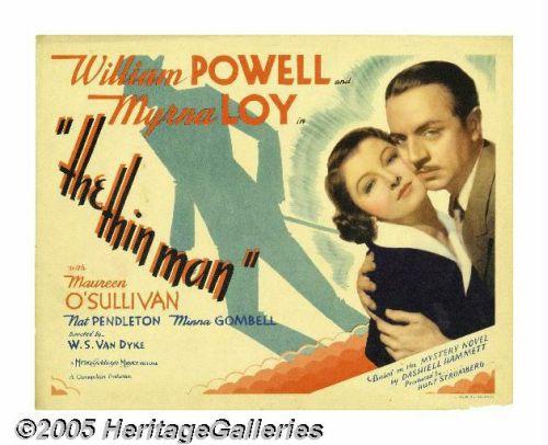 <B>The Thin Man (MGM, 1934).</B></I> Title Lobby Card (11" X 14"). Director Woody Van Dyke shot this film in two weeks and it went on to spawn five sequels and more imitations than one can count. This famous film, the first pairing of Powell and Loy, was one of the top films of the year and was nominated for four Academy Awards. It to this day, it remains one of the gems of cinema history. This very rare title card is unrestored and has a slight amount of paper off of the lower right corner. This paper loss in no way interferes with the image. There is very slight wear on the upper left corner with a small quarter-inch tear and a minor dust shadow. This card is stunning and the colors are solid. Very Fine-.