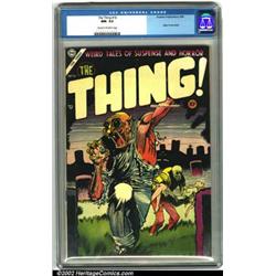The Thing! #16 (Charlton, 1954). A very popular pre-code horror comic, this has a striking cover and features an "injury to the eye" panel in one story. This is a top-notch copy of this rare title, with razor-sharp corners and fresh, superb colors. A great-looking book, and a perfect addition to any pre-code horror collection. CGC NM- 9.2 Cream to off-white pages. Overstreet 2001 NM 9.4 value = $240.  Important notice: We expect to be auctioning lots at the rate of 200-250 per hour. Sometimes eBay Premier live bid software cannot keep up with that pace, so we strongly recommend that you place a realistic proxy bid now as insurance to avoid disappointment. Also please note that all Heritage/CAA lots purchased through eBay Premier carry a 20% Buyer's Premium.