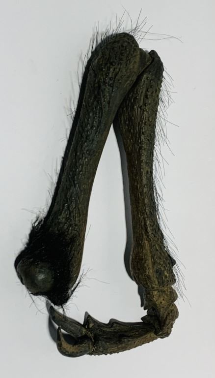 Made of rubber and hair with metal armature to pose the legs.