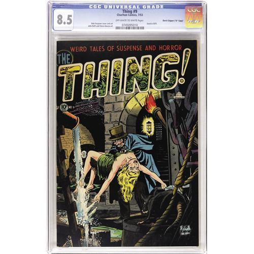 <B>The Thing! #9 Davis Crippen ("D" Copy) pedigree (Charlton, 1953) CGC VF+ 8.5 Off-white to white pages.</B></I> From the days when Charlton was cool, here's a pre-Code beauty with a sexy cover by Bob Forgione. Actually, the issue was sooo sexy (or violent) that it got cited in <B>Seduction of the Innocent</B></I>. Overstreet 2006 VF 8.0 value = $500; VF/NM 9.0 value = $788. CGC census 7/06: 2 in 8.5, 2 higher. <I>From the Crippen Collection</B></I>. <BR><BR><B>Important notice:</B> Heritage usually auctions material at the rate of 200-250 lots per hour. On some occasions eBay Live bid software or the Internet may not be able to keep up with the pace of the auction. We recommend placing a realistic absentee bid now as insurance to avoid disappointment. Occasionally the auctioneer may eliminate or reject an eBay Live bid, and the auctioneer may also reopen a lot after the close of the eBay live bidding (usually because we missed an audience bid), and may reject your bid even if it shows you as the winning bidder. By bidding via eBay Live, you agree that Heritage may award the lot to another bidder at its sole discretion under the circumstances described above or any other reasonable circumstances. Since eBay bids are not shown to us until we open the lot on the floor, we treat those bids just like floor bids. In most cases the floor responds before the eBay bid is presented to us, due to Internet lag time, so for consistency we have made it a policy that floor bids are always considered first over tie eBay live bids. Also please note that all Heritage lots purchased through eBay Live carry a 22.5% Buyer's Premium. Please make sure you read the Terms and Conditions before you bid. This lot is being auctioned in conjunction with a live floor auction by Heritage Auction Galleries. All final auction and invoice information will be supplied by Heritage Auction Galleries, and all other information should be considered preliminary. Lot:41001 <BR><BR><B>Winning Notification and Billing:</B> After the FINAL session in this auction is complete, Heritage will send e-mail and snail mail invoices. This process normally takes several days. All final auction and invoice information will be supplied by Heritage Auction Galleries, and all other information should be considered preliminary. <BR><BR>This auction will be conducted on a live auction floor and over the Internet through eBay Live. If you choose to place an absentee bid, please take a moment to <font color='#0000ff'><u><a href='http://pages.ebay.com/liveauctions/help/before/laabsentee.html'>learn how eBay Live absentee bidding works</a></u></font><font color='#000000'>