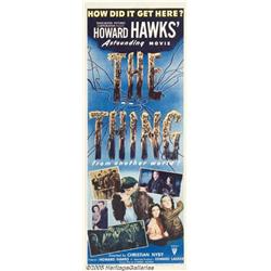 <B>The Thing From Another World (RKO, 1951)</B></I> Insert (14" X 36"). Producer Howard Hawks' strong and suspenseful film is not your routine science-fiction picture. He brought his directorial talents to this film and in the process elevated the entire quality of the genre. To this day, this version of John W. Campbell Jr.'s sci-fi thriller remains unsurpassed for intense suspense. There are several tears and creases around the borders, and a few slight tears in the background graphics. This poster has been professionally restored, rendering these defects hard to detect. Posters for this title are highly prized and this insert is one of the most sought after for its rich colors and striking graphics. Rolled, Very Fine on Paper.