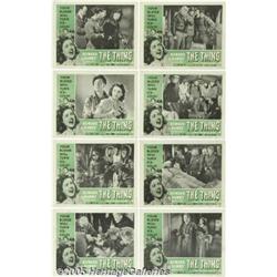 <B>The Thing From Another World (RKO, R-1954)</B></I> Lobby Card Set of 8 (11" X 14"). The original lobby card set to this science fiction classic is extremely hard to come by. This great reissue set is almost as difficult. The set has approximately four pinholes per card (some more) and one scene has a tear in the top center border and another has an upper left corner crease. Fine.