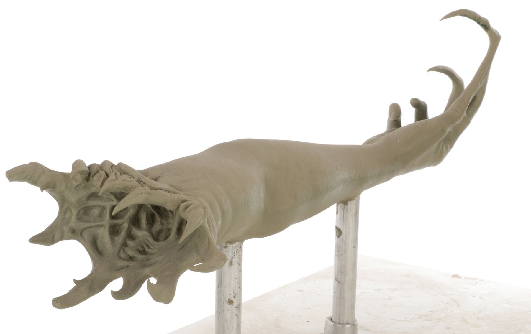 416. The Thing life-size study maquette of human/alien arm creature. (Universal, 2011) Original maquette character study constructed of gray oil-based modeling clay on armature. Representing a hybrid of a human arm warped by the DNA of an alien shape-shifter to create an otherworldly, gnarled creature limb. The modeling clay remains static, but can become malleable with heat. The maquette measures 27 x 9 x 16 in. Mounted on a pair of 9 in. Steel pipes affixed to a wooden base of 32 x15 x 1 in. In very good condition. $400 - $600