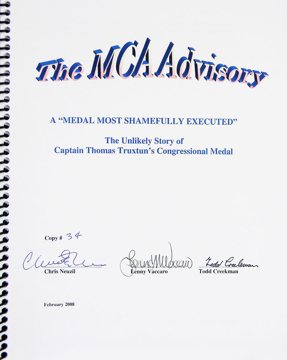 Neuzil, Chris, Lenny Vaccaro and Todd Creekman. A “MEDAL MOST SHAMEFULLY EXECUTED”: THE UNLIKELY STORY OF CAPTAIN THOMAS TRUXTUN’S CONGRESSIONAL MEDAL. Boston: Medal Collectors of America, 2008. 4to, original spiral binding. 2-41 pages; illustrated in color and black and white. Signed by the authors on front cover. New. An authorized offprint from the MCA Advisory, issued in very limited quantities.