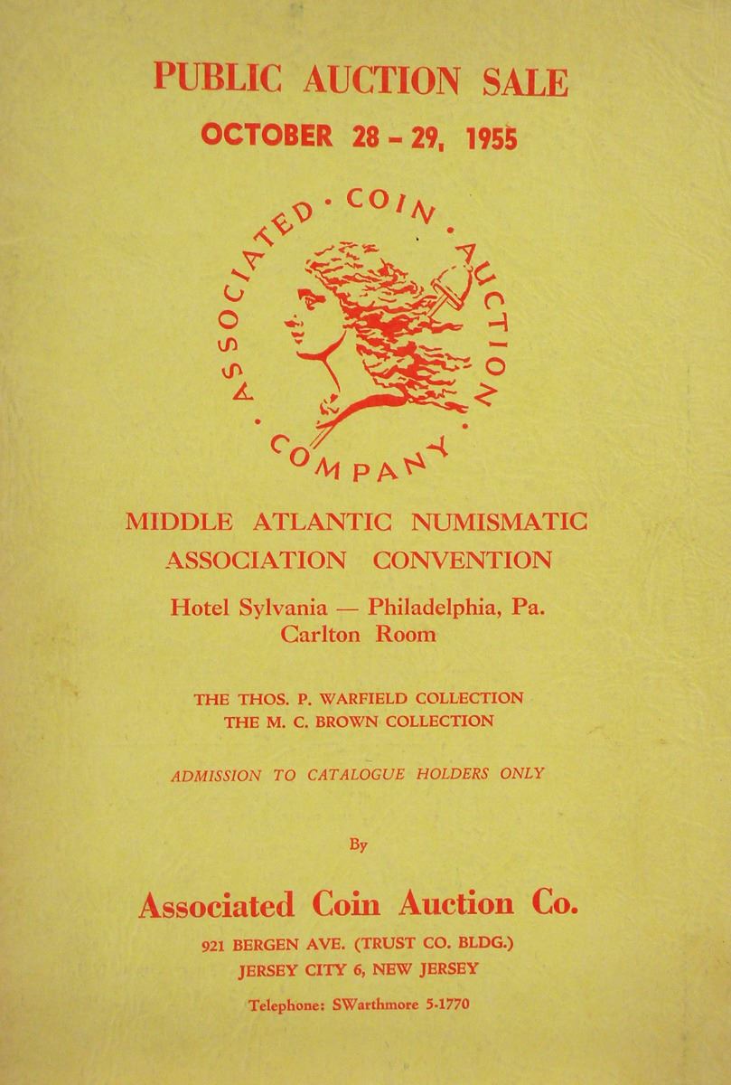 Associated Coin Auction Co. MIDDLE ATLANTIC NUMISMATIC ASSOCIATION CONVENTION. THE THOS. WARFIELD COLLECTION. THE M.C. BROWN COLLECTION. Philadelphia, Oct. 28-29, 1955. 8vo, original printed card covers. 94, (2) pages; 1842 lots; 8 halftone plates, 4 of which depict large cents. Original prices realized list laid in. Near fine. An important sale of nearly 700 large cents.