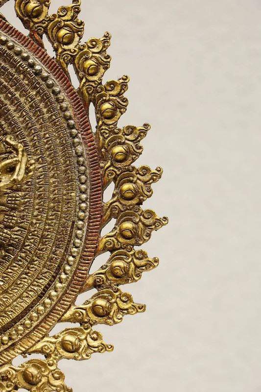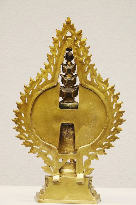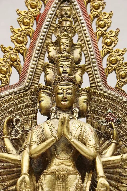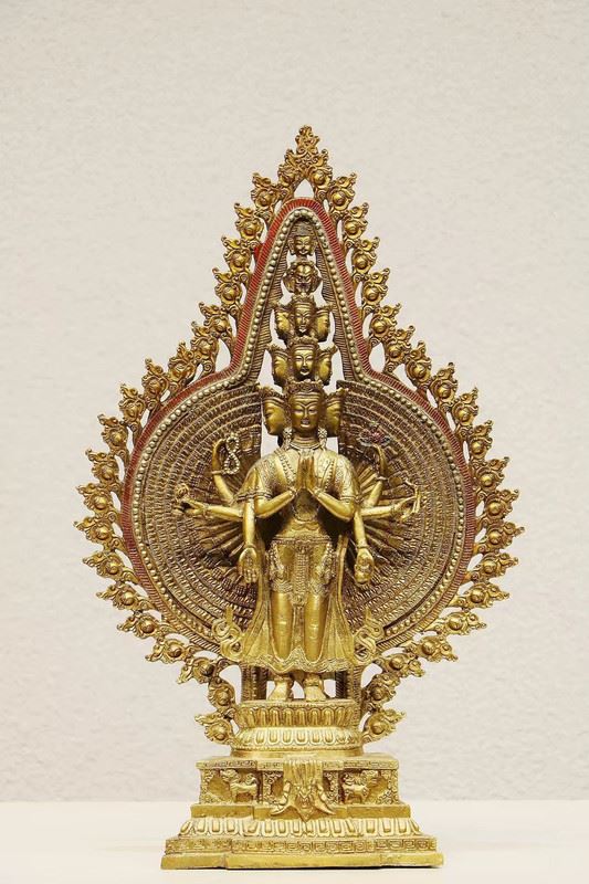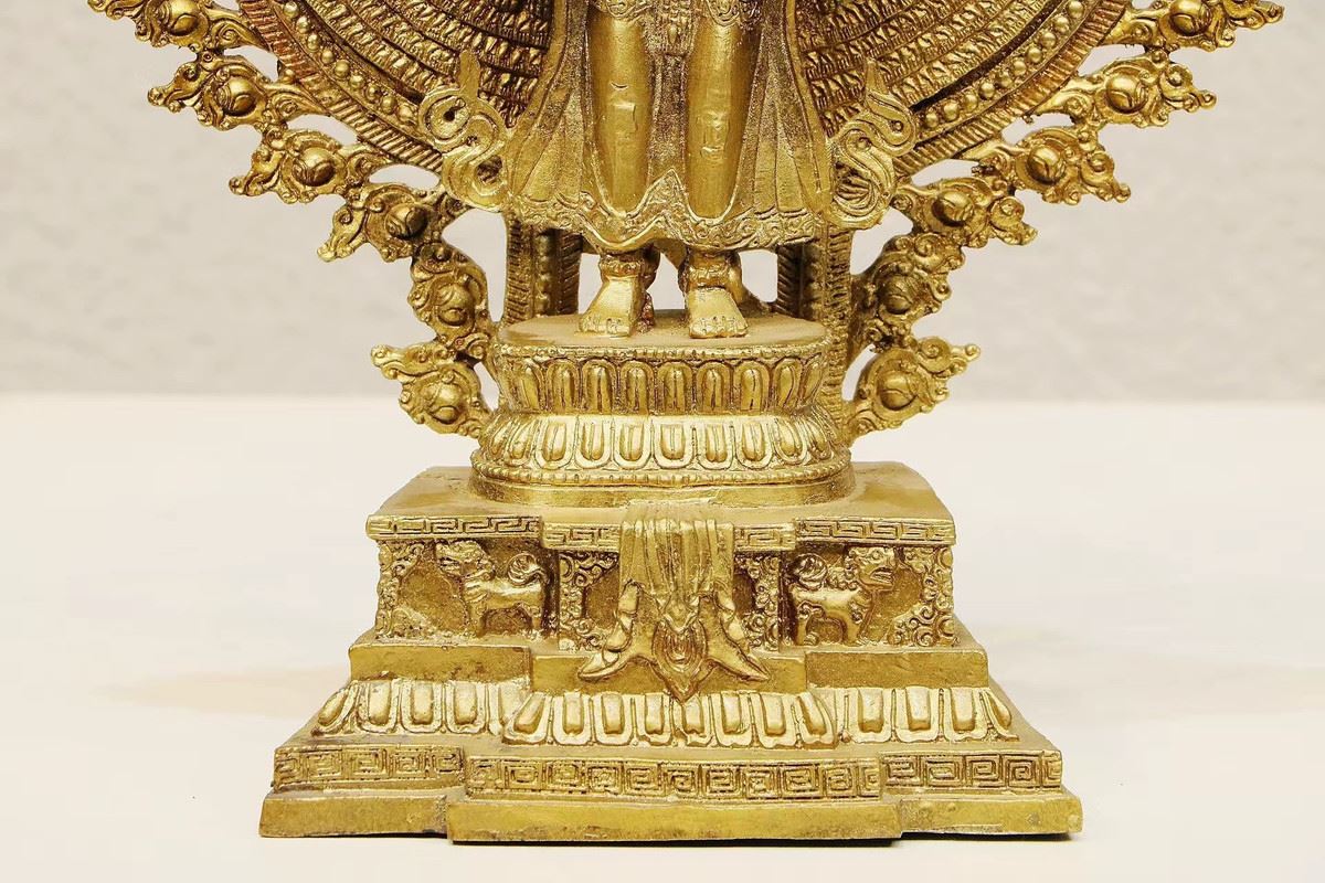 This statue showcases Avalokiteshvara in her thousand-armed form, symbolizing boundless compassion and assistance. The extended hands represent her ability to reach out and relieve the suffering of all beings in the world. The golden halo and intricate floral details enhance the sacred aura of the statue. This sculpture embodies classic elements of Buddhist art, offering a profound representation of the spirit of compassion.