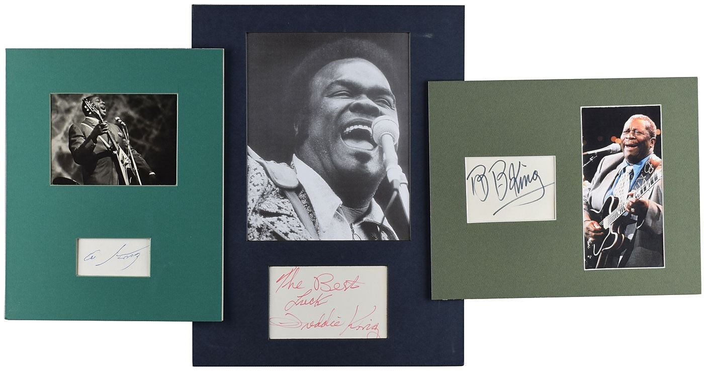 Fabulous group of three signatures of the 'Three Kings' blues guitarists: a black felt tip signature of B. B. King, "B. B. King," on a white 4 x 2.75 card; a blue ballpoint signature of Albert King, "Al King," on a white 3.25 x 1.5 card; and a red felt tip signature of Freddie King, "The Best Luck, Freddie King," on a white 5 x 3 card. Individually matted and framed with images of the bluesmen to overall sizes ranging from 9.5 x 11.75 to 11.75 x 15.75. In overall fine condition.