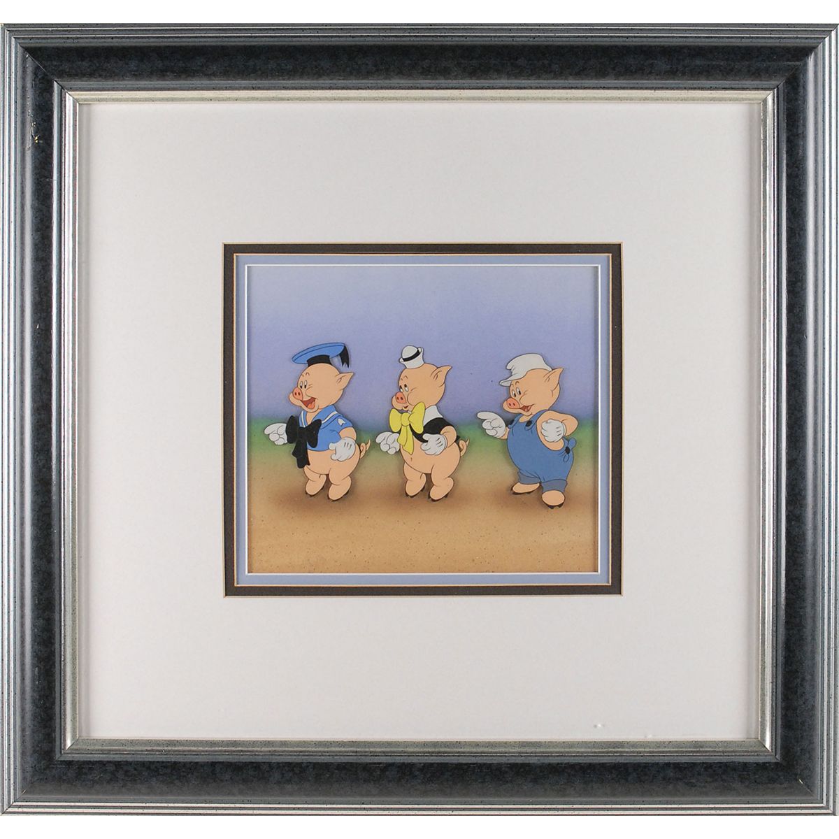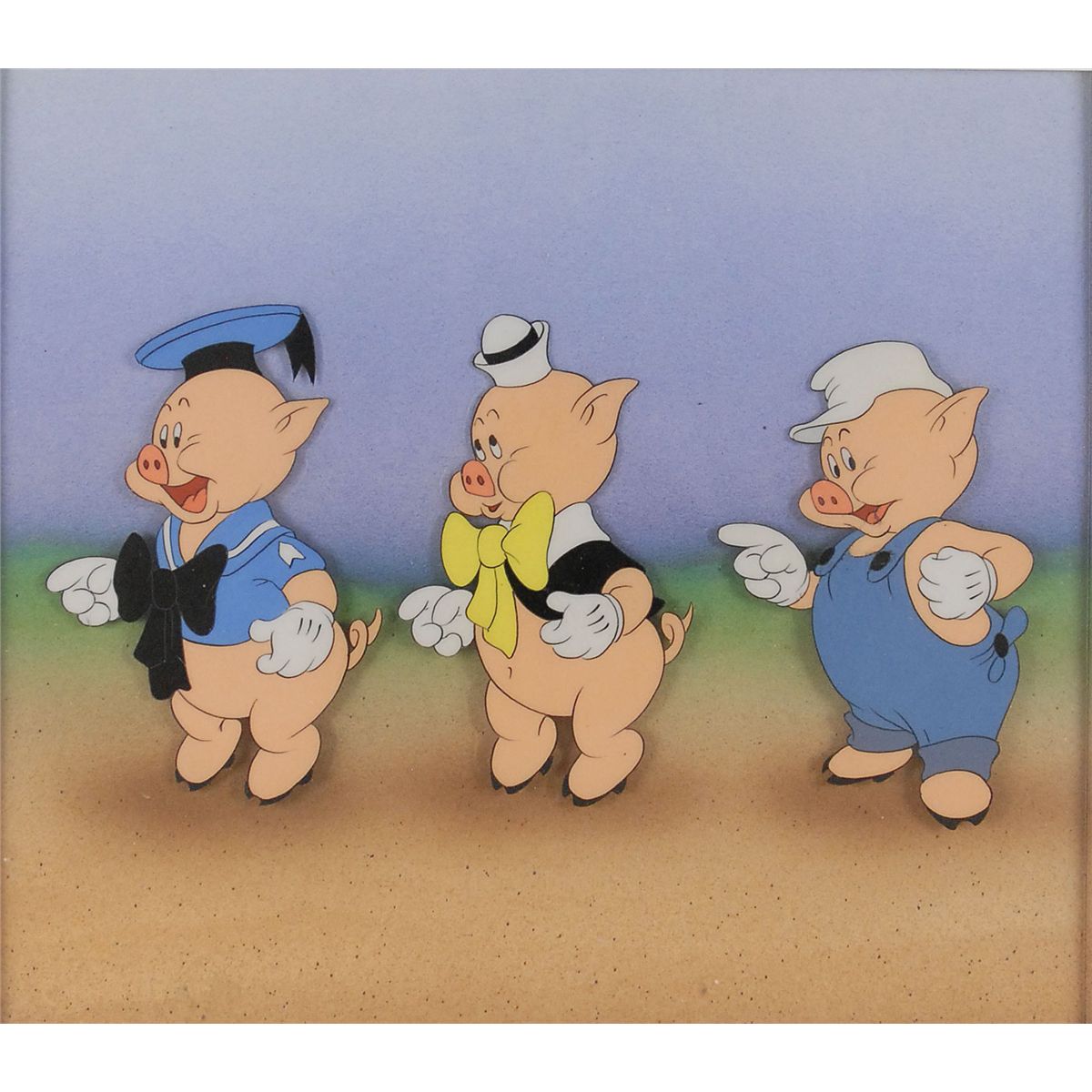 (Walt Disney Studios, Circa 1936–1937) Original production cel featuring the Three Little Pigs from The Three Little Pigs, showing each pig character in a different costume. The cels are trimmed to image and placed on an airbrushed background. Each image measures 2 x 3.5, with a mat opening of 8 x 7. This piece is also framed to an overall size of 19.5 x 18.5. In fine condition.