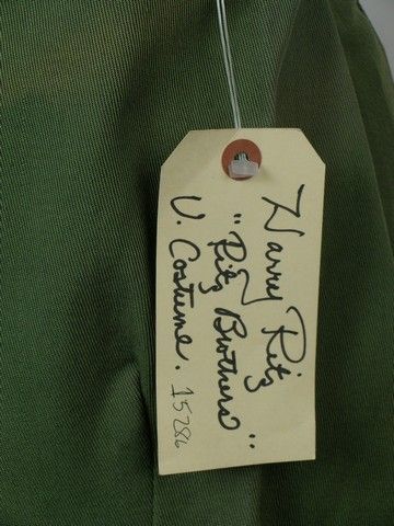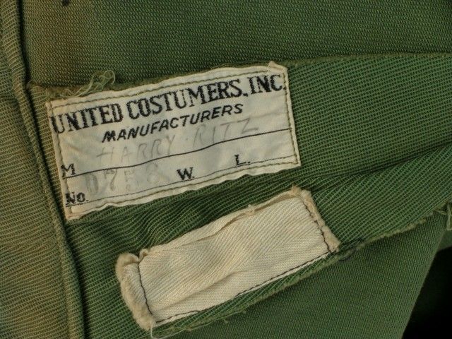 From one of the most unusual, successful and hysterical versions of Alexandre Dumas' masterwork "The Three Musketeers" (1939), these are Harry Ritz, of the Ritz Brother's fame, hero screen worn green pants. Harry Ritz was a legend who Mel Brooks once said taught him and the world all they need to know about zany comedy. It includes the original United Costumers, Inc. label with HARRY RITZ written in ink.