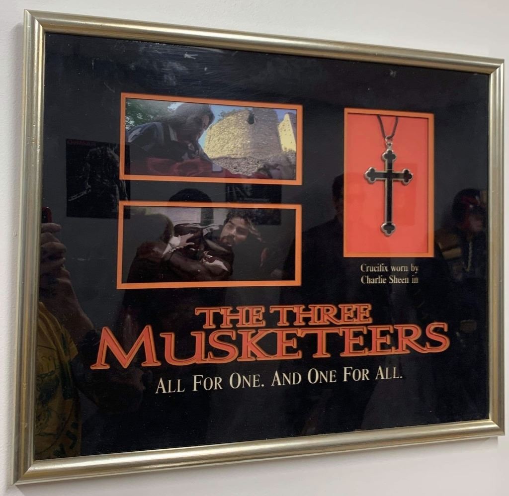 Original hero crucifix pendant worn by "Aramis", played by Charlie Sheen in the action-adventure comedy film "The Three Musketeers" (1993), where, in France, 1625: Young d'Artagnan heads to Paris to join the Musketeers but the evil cardinal's disbanded them - save 3. He meets the 3, Athos, Porthos and Aramis, and joins them on their quest to save the king and country. It stars Charlie Sheen, Kiefer Sutherland, Chris O'Donnell, Oliver Platt, Tim Curry, and Rebecca De Mornay.