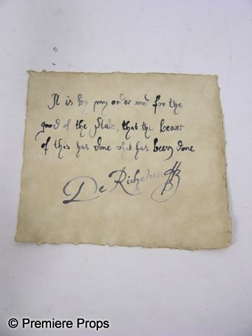 Cardinal Richelieu (Christoph Waltz) screen used, handwritten on parchment paper folded note from the Louvre Garden.