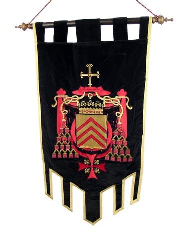 Screen used, black velvet with gold trim and gold and red crest with crosses banner on a wood pole and rope. (approx. 62" x 30") One side of the wood pole needs to be glued to hold in place.