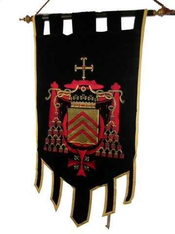 Screen used, black with gold and red design large flag hanging on a rope. (approx. 3' wide and 5' long) Condition may vary.