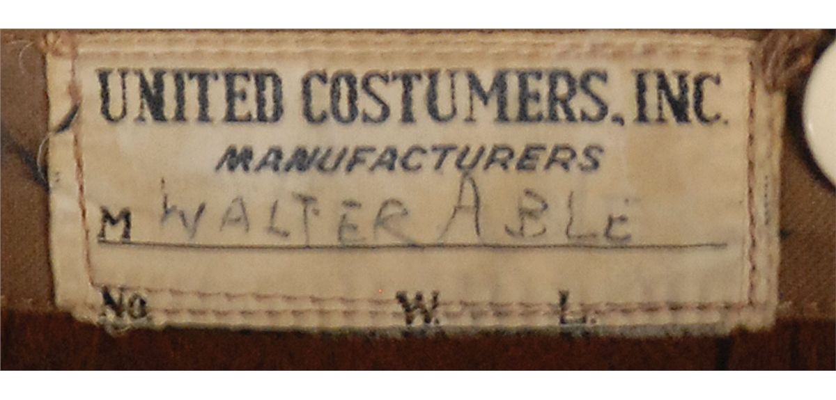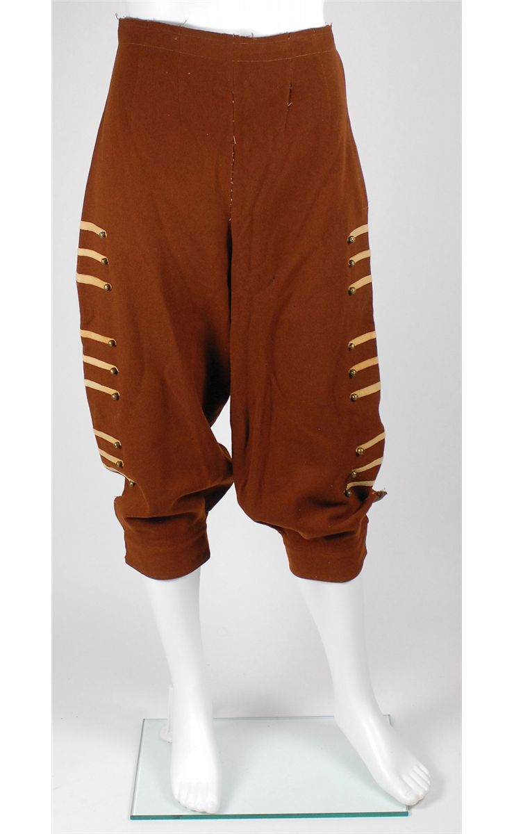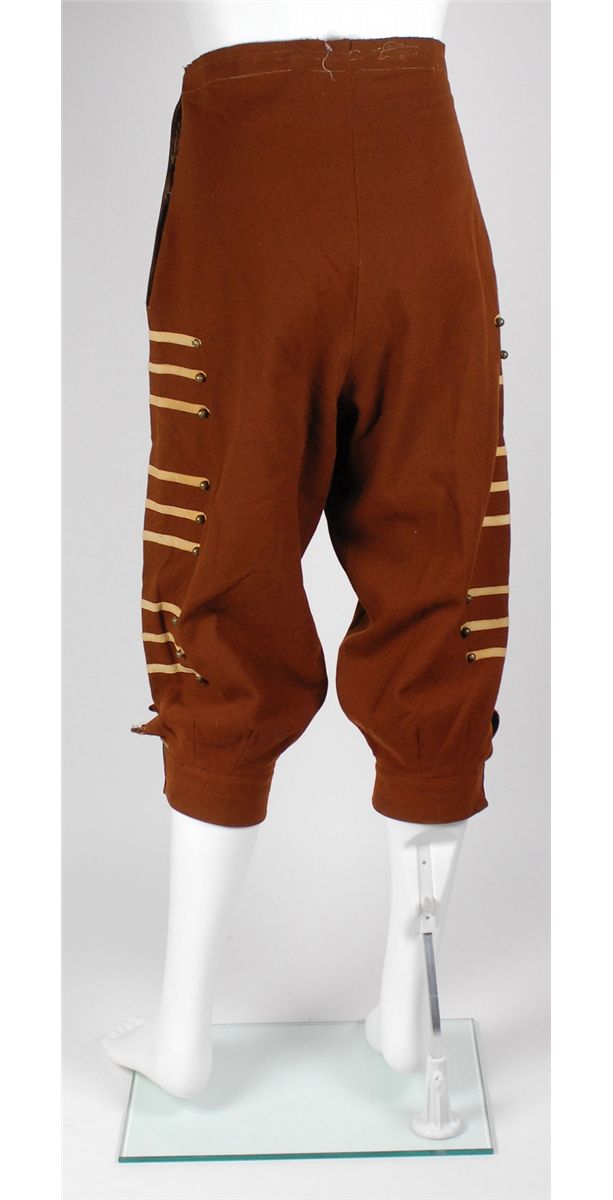 Pants worn by Abel as D'Artagnan in the 1935 film The Three Musketeers. Brown pants feature three sets of three ivory stripes with small metallic beads at each end. A United Costumer’s tag is sewn into the waistband with Abel’s name written on the first line. In fine condition.