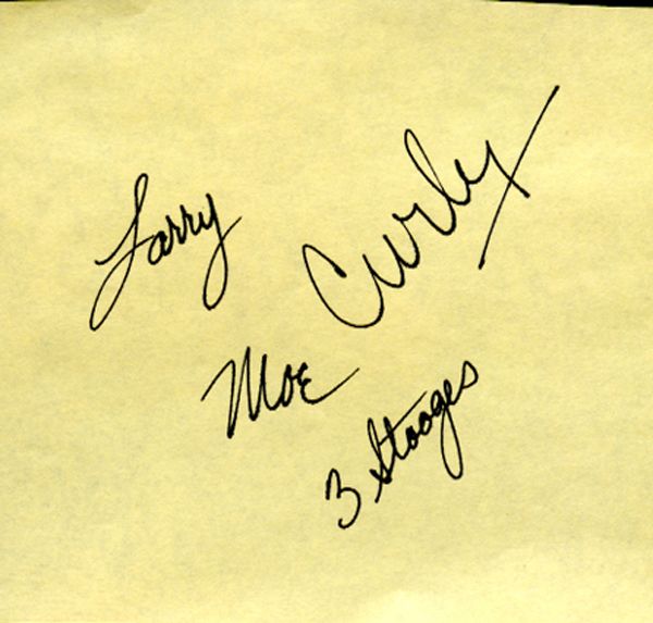 Original 30s autograph page in fountain ink with Moe Howard adding 3 Stooges in his hand and first name, as well as signatures from Larry and Curly. This item comes with a certificate of authenticity good for the life of the piece.
