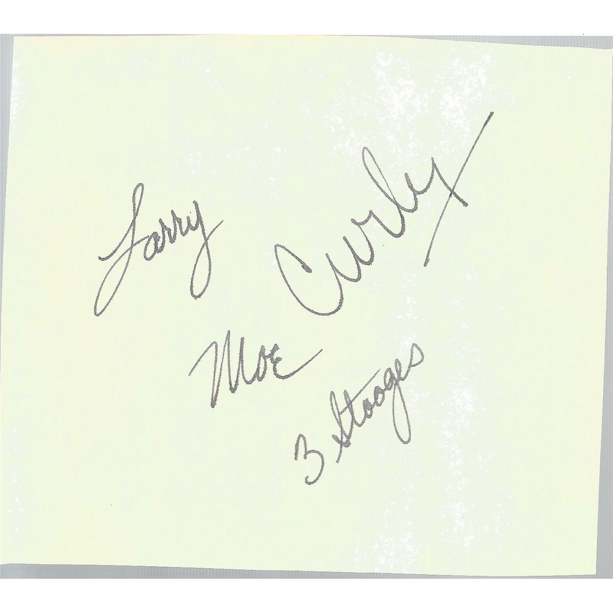 Scarce 3x5 autograph book page using fountain ink signed by Larry, Curly, and Moe and inscribed 3 Stooges by Moe