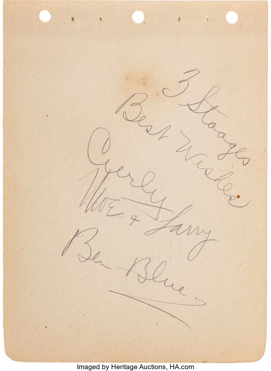 The Three Stooges Signed and Inscribed Album Page. A toned album page signed (and inscribed "3 Stooges / Best Wishes") by Curly, Moe, and Larry, as well as Ben Blue, with a ballpoint pen. Has an unidentified signature on verso. Measures 4 ½" x 6". In Very Good condition with toning, as well as a light spot of soiling. COA from Heritage Auctions.