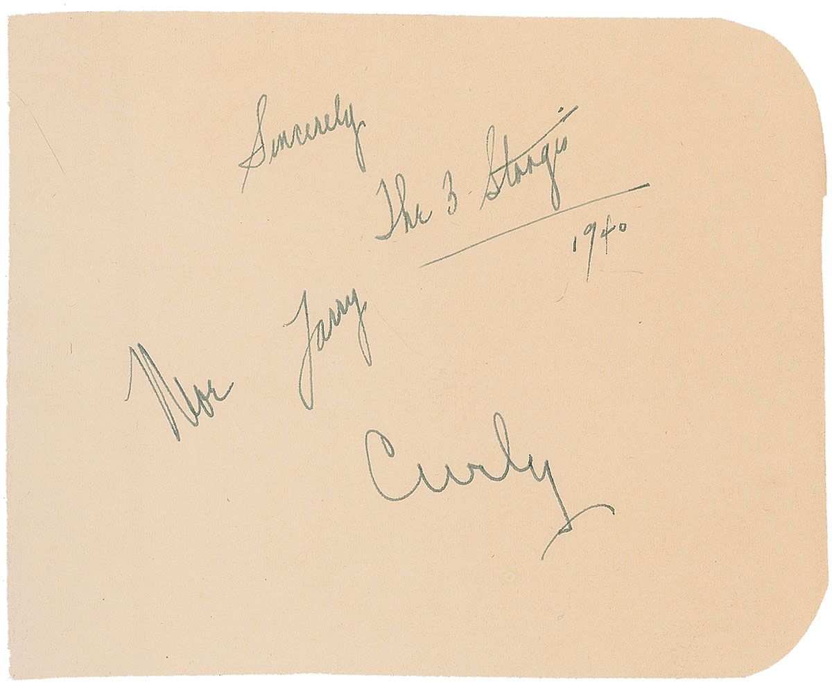 Vintage fountain pen signatures, “Sincerely, The 3 Stooges, 1940, Larry,” “Moe,” and “Curly,” on an off-white 6 x 4.75 album page. In fine condition. Crisp, clean signatures from the legendary comedy trio. Accompanied by a full letter of authenticity from JSA.
