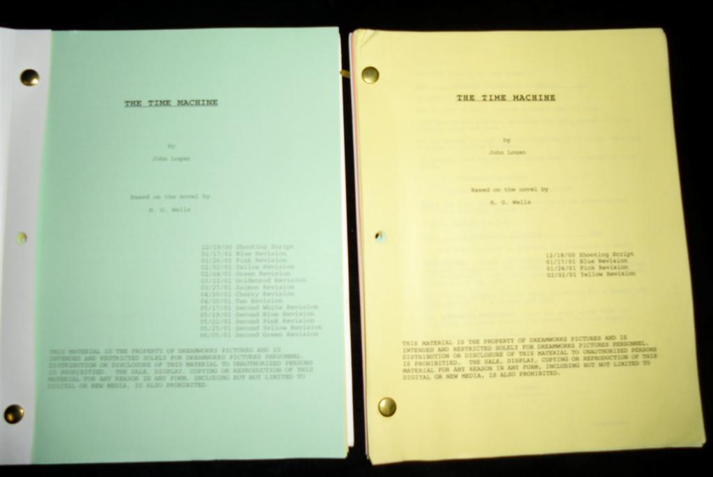 The Time Machine (2002) - Two original production screenplays written by John Logan and dated 6/5/01 with colored pages. One draft in Amblin cover.