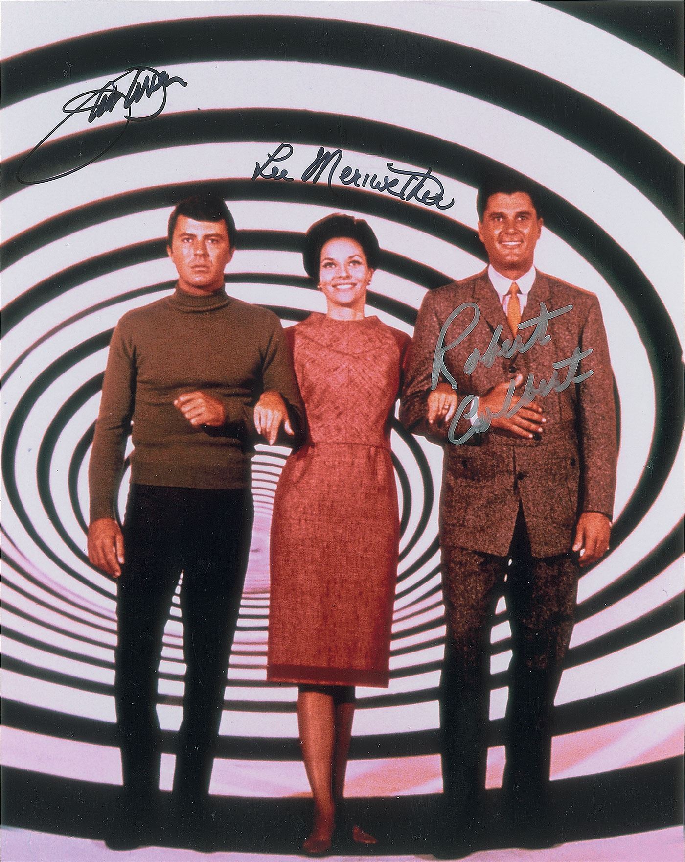 Color glossy 8 x 10 photo of Doctors Newman, McGregor, and Phillips from the science fiction television series The Time Tunnel, signed in black felt tip by James Darren and Lee Meriwether, and in silver ink by Robert Colbert. In fine condition.