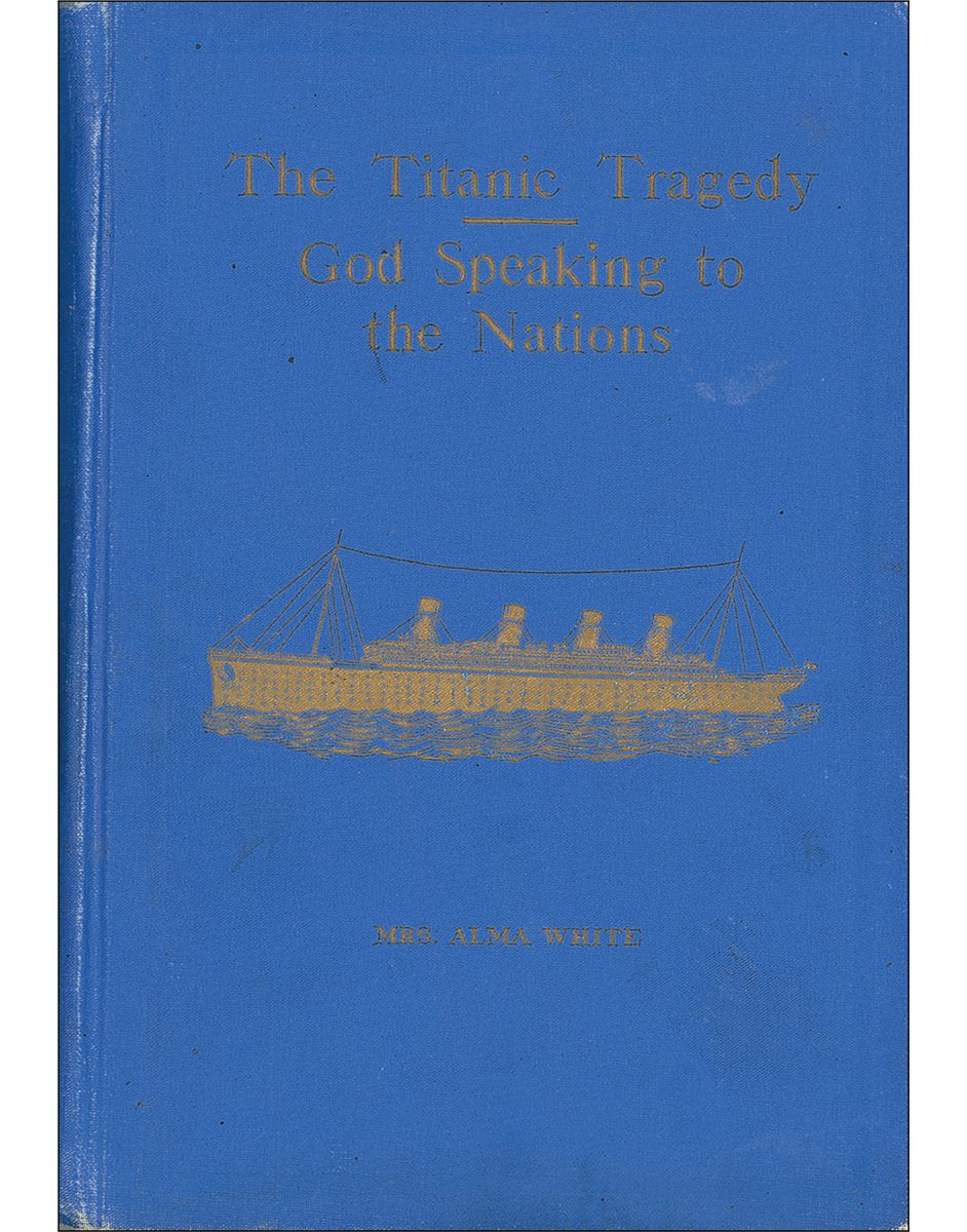 Rare blue hardcover, gold-lettered copy of The Titanic Tragedy: God Speaking to the Nations, by Alma White, Pentecostal Union, Bound Brook, New Jersey, 1912. Cover features a gold-printed silhouette of the Titanic. Hinge is cracked, but repaired.