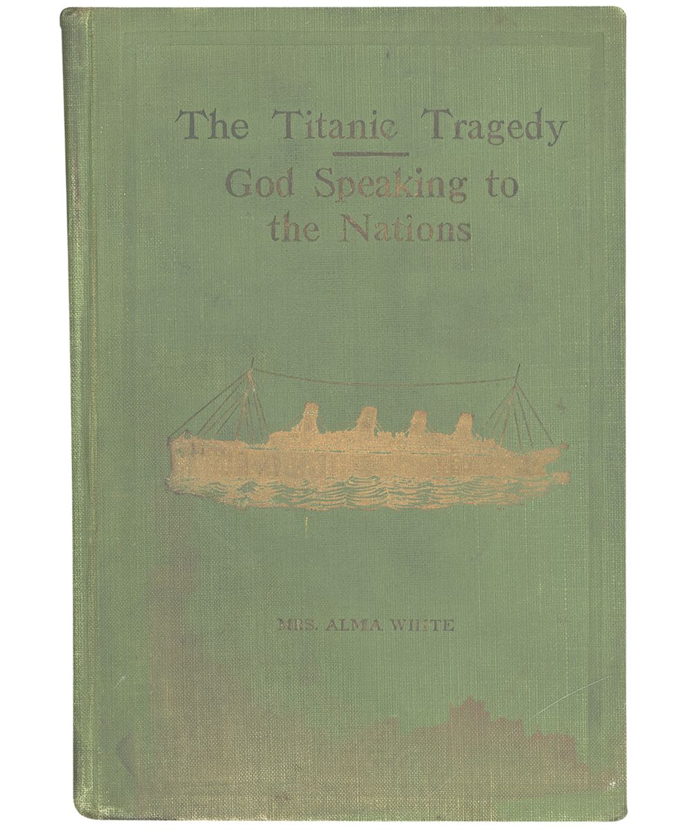 The Titanic Tragedy—God Speaking to the Nations by Alma White. Bound Brook, NJ: The Pentecostal Union, 1913. Green hardcover, 5.25 x 7.75, 211 pages. White argues that the Titanic disaster was caused by God in retribution for a sinful world. In very good condition, with a cracked front hinge, soiling to the lower portion of the front cover, and light damp staining to the bottom of the pages.
