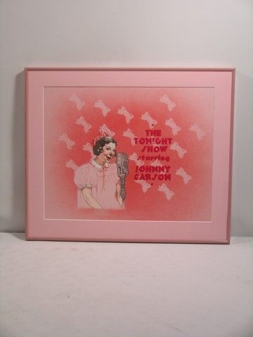 From the legendary, long running late night talk show 'The Tonight Show with Johnny Carson,' this is a one-of-a-kind screen used title card for the show. This colorful card was used when the 'Tonight Show' took its station breaks, and features a 1940's style image of a woman talking on an old NBC microphone with faint pink bowties in the background. Image is affixed to a pink cardboard backing and matching pink frame with attached wire for display. If you remember watching the 'Tonight Show,' chances are you recognize this piece of television history. (measures approx. 19 1/2"x 23")