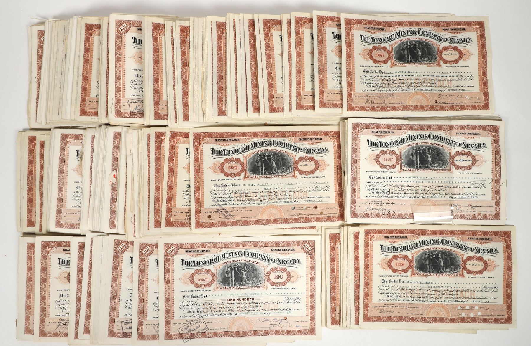 over 150. The Tonopah Mining Company of Nevada Stocks, c1940's, Various cond. Security BNC printer.