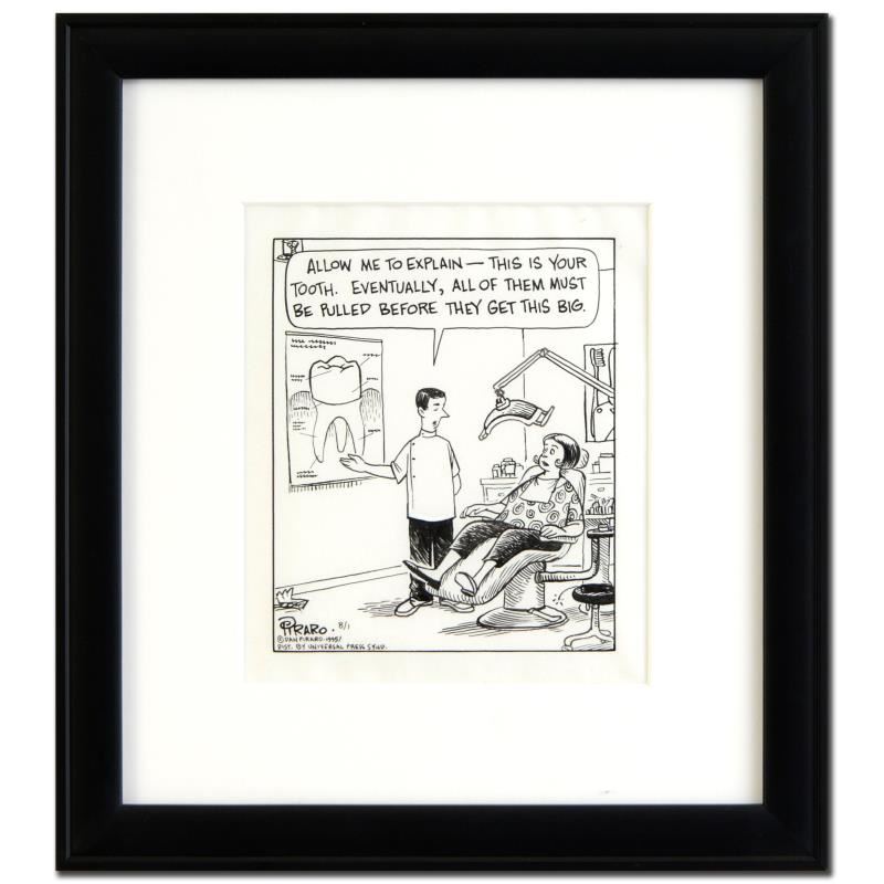 Enter a surreal and satirical world of twisted imagination and award winning creativity. "The Tooth" is an original pen & ink drawing on paper by Dan Piraro, creator of the critically acclaimed and award winning comic strip, Bizarro! This piece is hand signed and comes framed. Includes Certificate of Authenticity! Measures approx. 13" x 14" (frame), 6" x 7" (image).