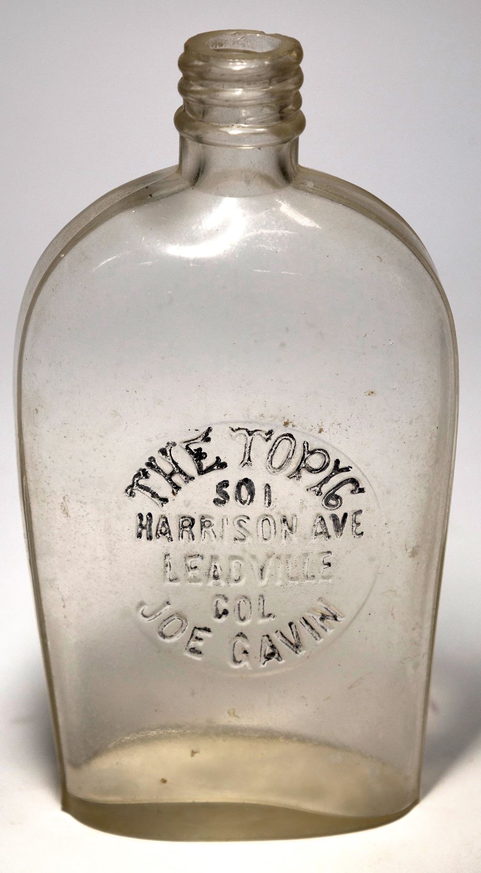 Clear coffin bottle. The Topic/501/Harrison Ave./ Leadville Col/Joe Gavin. 7" tall, screw top. Small chip on top thread, no other apparent chips or cracks.