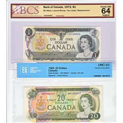 1973 $1 BC-46aA #*IA BCS & 1969 $20 BC-50b CCCS UNC63. Lot of 2 notes.1723 - 1973 $1 BC-46aA #*IA BCS & 1969 $20 BC-50b CCCS UNC63. Lot of 2 notes.