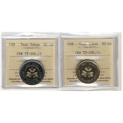 Test Token CH# TT-100,14 & TT-200,17 ICCS MS66. Lot of 2 coins.