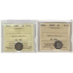Nfld 1882H 5¢ & 1894 ICCS F12. Lot of 2 coins.