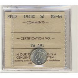 Nfld 1943c 5¢ ICCS MS64.