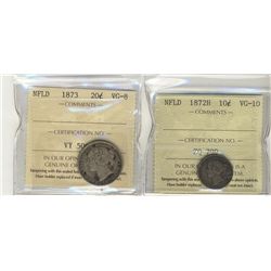Nfld 1872H 10¢ VG10 & 1873 VG8. Lot of 2 ICCS coins.