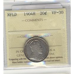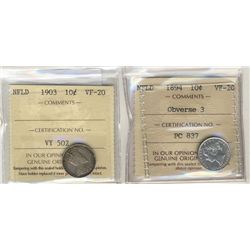 Nfld 1894 10¢ Obv 3 & 1903 ICCS VF20. Lot of 2 coins.