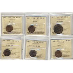 1901 1¢, 1934, 1935, 1941, 1942 & 1945 all ICCS MS60. Lot of 6 coins.