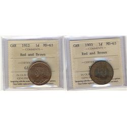 1903 & 1912 1¢ ICCS MS63RB. Lot of 2 coins.
