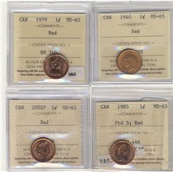 1940(2) 1¢, 1942 & 1965 LgBds Ptd ICCS MS63RD and RB. Lot of 4 coins.