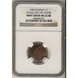Mint Error Canada 1980 1¢ Struck 25% Off Center NGC MS62RB.