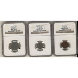 Mint Error Canada Blank Planchet 1¢ (2.5gr), 10¢(1,8 gr) & 25¢ (4,5gr). Lot of 3 coins all slabbed by NGC.