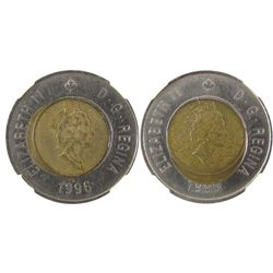 Mint Error Canada 1996 & 1999 $2 Off Set Center Insert. Lot of 2 coins with 1999 designated Obv scratch.