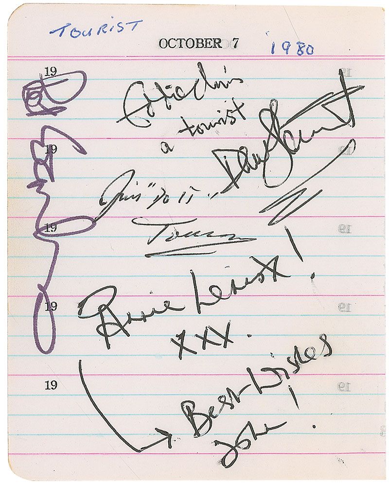 Ink signatures of Annie Lennox, Dave Stewart, Pete Coombes, and Eddie Chin on a 3.5 x 4.5 date book page from 1980, with one adding a brief inscription. In fine condition, with some scattered light soiling. Accompanied by a full letter of authenticity from Roger Epperson/REAL.
