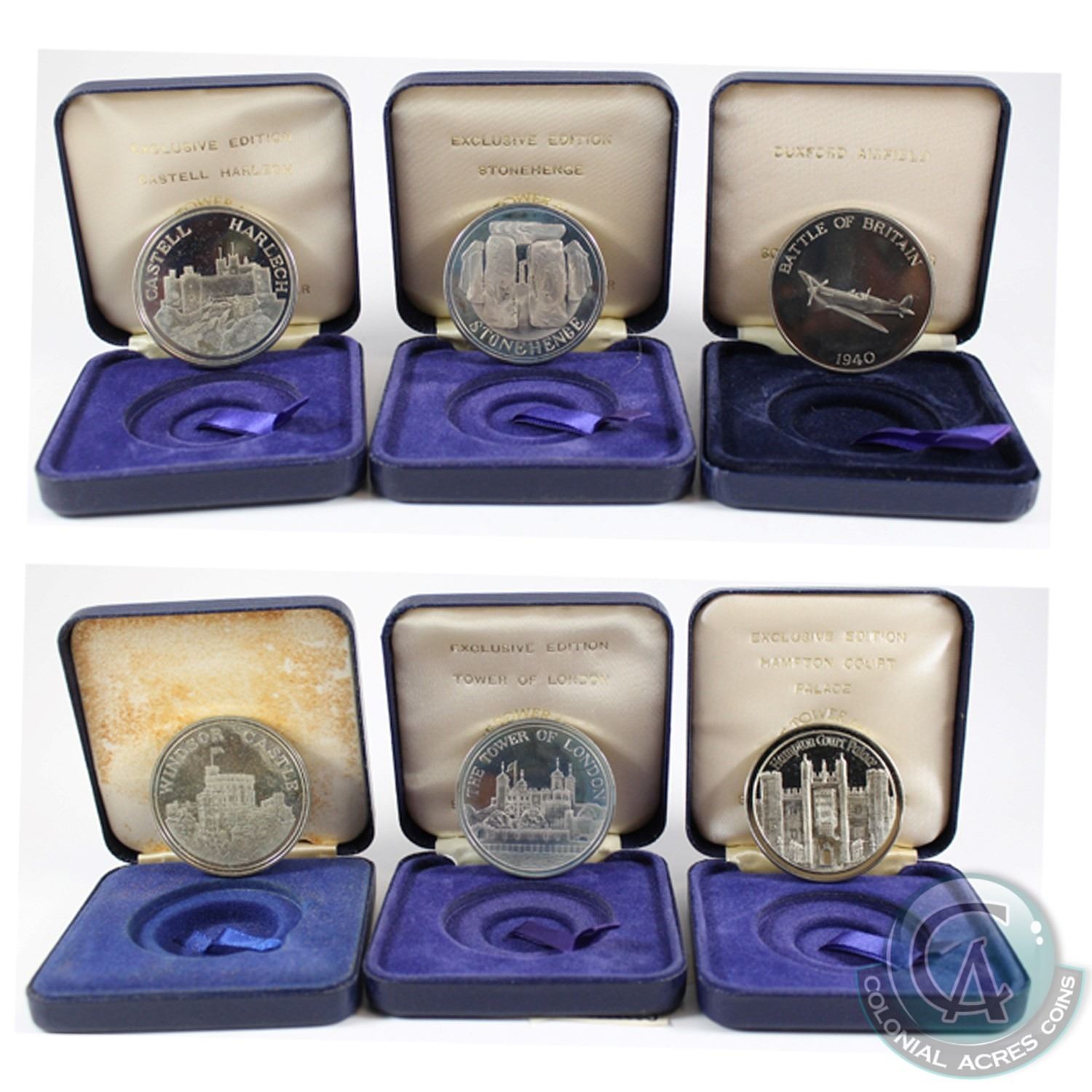 The Tower Mint Issue: Lot of 6x Nickel Silver Medallions Featuring Different English Landmarks in Blue Display Boxes. You will receive Stonehenge, The Tower of London, Hampton Court Palace, Battle of Britain, Castell Harlech & Windsor Castle. Medallions may be toned. 6pcs