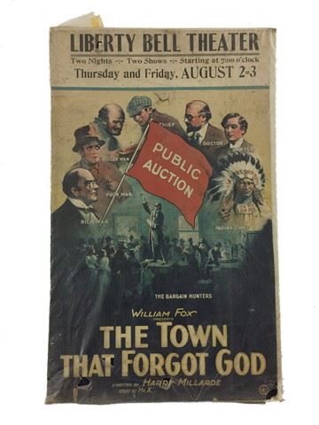 The Town That Forgot God (Fox Film Corporation, 1922). Window card mounted on cardboard. Starring: Ben Grauer and Warren William. There are creases, marks, stains, paper loss and edge wear damage. Good. (14" X 21.5").