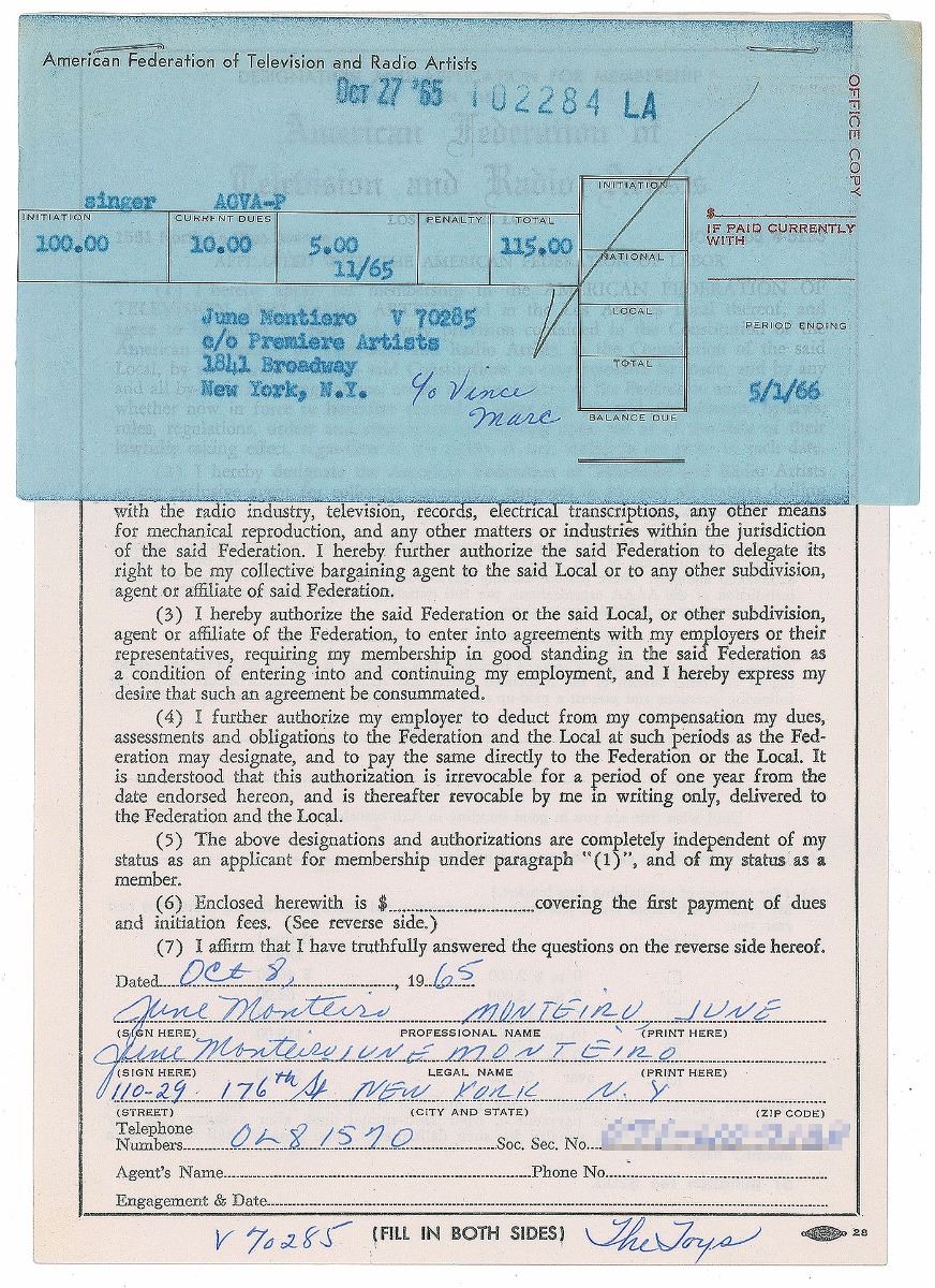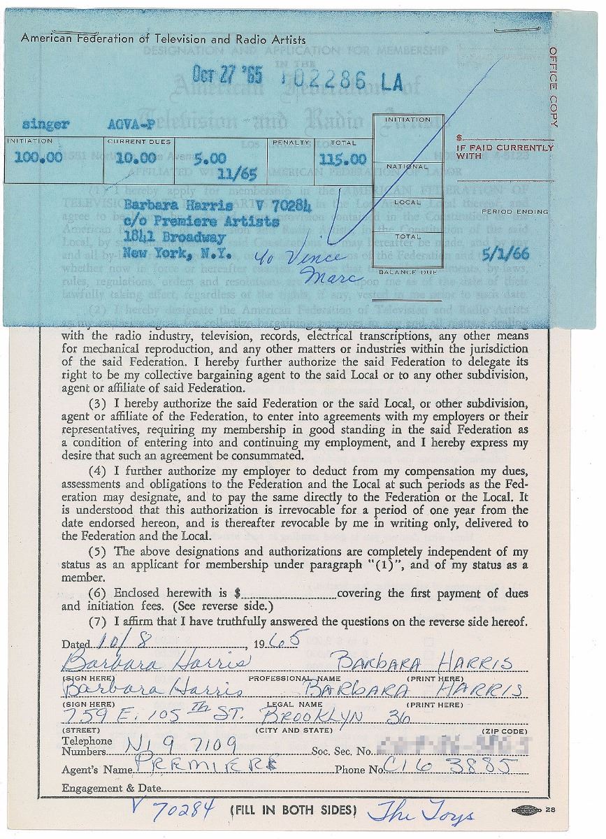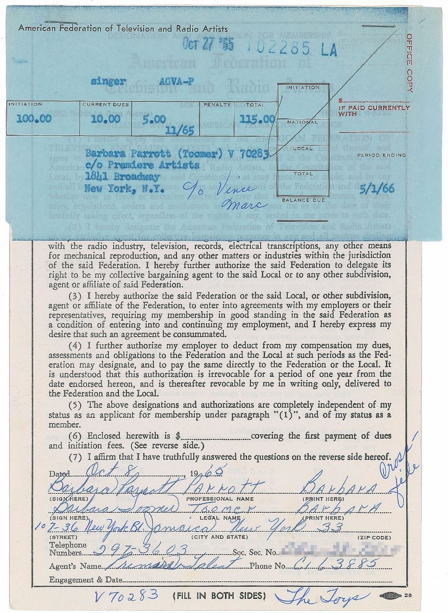 Female pop trio from New York active from 1961 through 1968. Three standard AFTRA membership applications, filled out and signed by The Toys members Barbara Harris, Barbara Parrott, and June Montiero, each one page, 6 x 8.75, dated October 27, 1965. In overall fine condition.