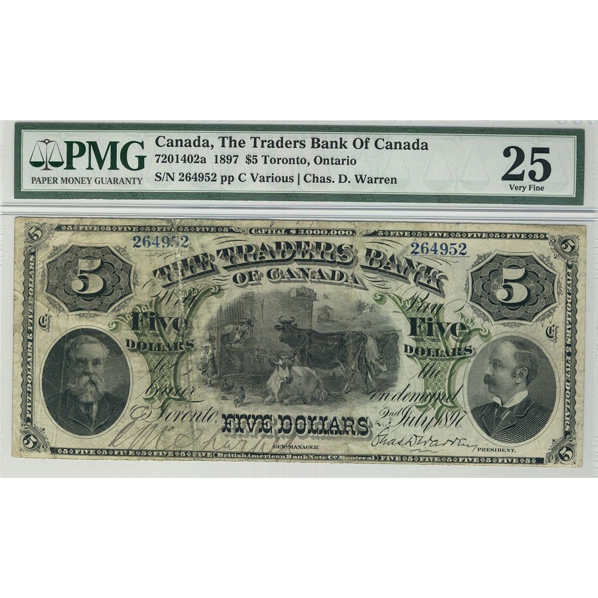 The Traders Bank of Canada 1897 $5 #264952 CH-720-14-02a. PMG VF25. A superior example, very nice, clean, crisp and attractive. Scarce this nice. Tied with only one other graded example.
