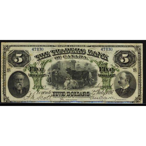 The Traders Bank of Canada 1897 $5 CH-No.47830 VF+. Possibly the finest known example surviving of a very rare Bank. Worth a premium bid.